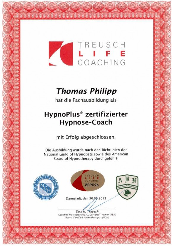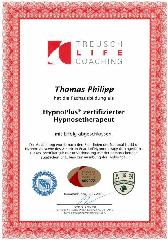 Ich bin ausgebildeter und zertifizierter HypnoPlus-Hypnosetherapeut sowie Hypnose-Coach, Mitglied der National Guild of Hypnotists und zusätzlich für die Hypnosebehandlung bei Depressionen zertifiziert. Auch im Bereich NLP bringe ich viel Erfahrung mit: Ich bin NLP-Master nach DVNLP sowie lizensierter NLP-Practitioner. Darüber hinaus habe ich mehrere Ausbildungen zum Practitioner für angewandte Kommunikationstechniken und Veränderungsmodelle erfolgreich abgeschlossen.